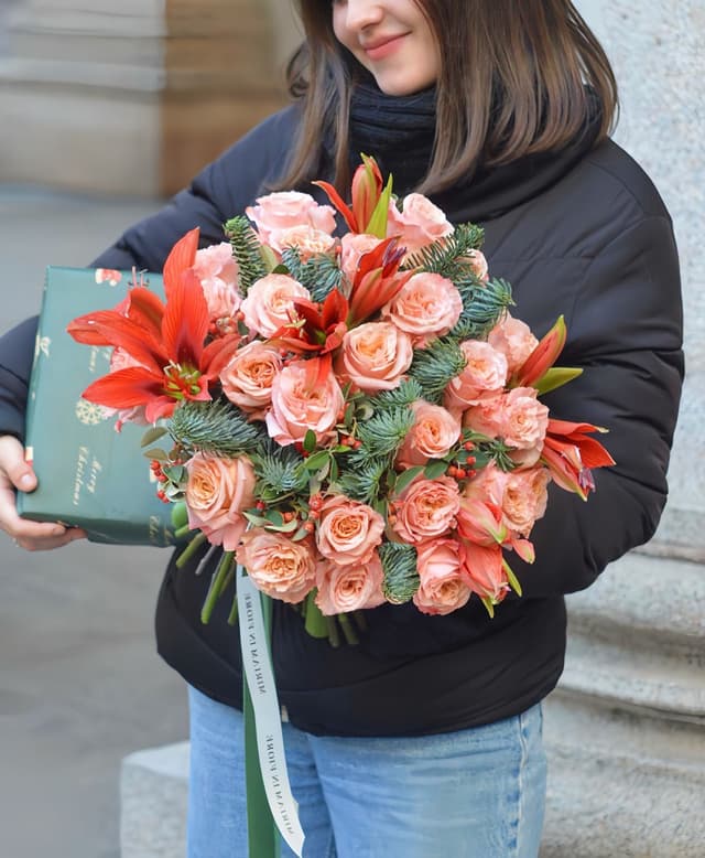Regalate un tocco di romanticismo alle vostre festività con il nostro Bouquet Natalizio dai Colori Delicati. La raffinata combinazione di tonalità pastello, accarezzate dalla magia del periodo natalizio, crea un'atmosfera avvolgente e unica. È possibile selezionare il colore delle rose. <br/><br/> <b>Misure:</b> <br/> <ul> <li>Realizzato con 25 Rose, 5 Amaryllis e abete </li>