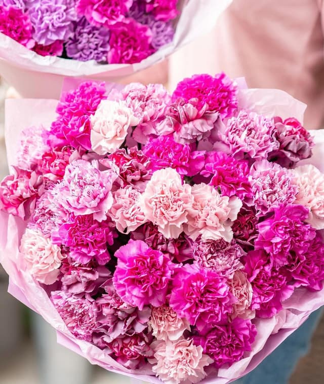 Generalmente i garofani esprimono amore, fascino e distinzione, anche se ci sono molte varianti dipendenti dal colore. In Giappone, il garofano è augurio di buona fortuna o buona guarigione. Il garofano rosso chiaro rappresenta ammirazione, mentre il rosso scuro denota profondo amore e affetto. <br/><br/> <b>Misure:</b> <br/> <ul> <li>L 40 steli </li> <li>XL 60 steli </li> <li>XXL 80 steli </li>